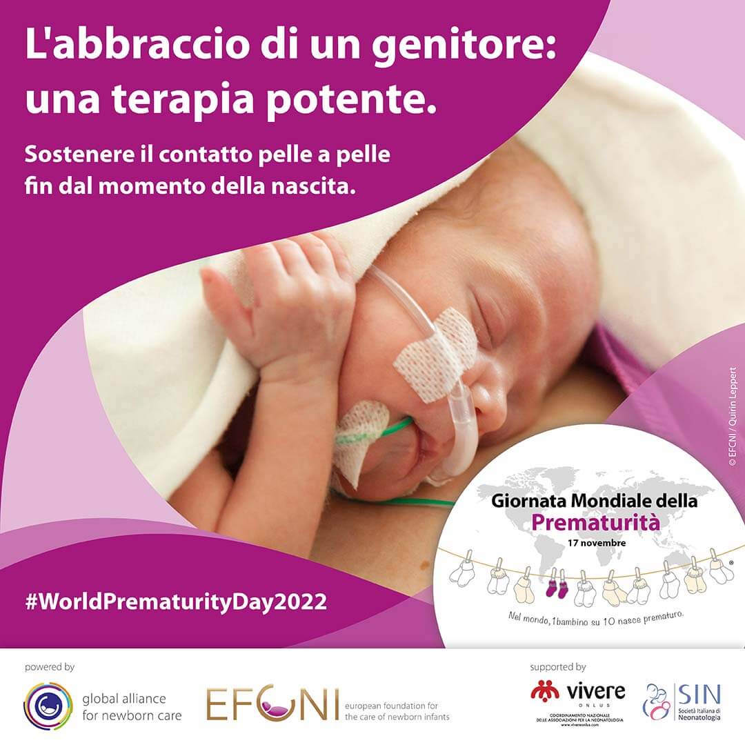 “L’abbraccio di un genitore: una terapia potente. Sostenere il contatto pelle a pelle fin dal momento della nascita.” è il tema della Giornata Mondiale della Prematurità 2022, che si celebra il 17 novembre e oggetto della campagna di sensibilizzazione della Fondazione Europea per la cura dei neonati pretermine (EFCNI).